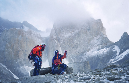 Martin Fickweiler and Gerke Hoekstra after a hard day´s work on the Central tower of Paine, Patagonia > photo Eric Frankenmolen