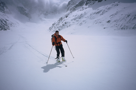 Vincent and I sharing one pair of ski's after a windslab avalanche accident > photo Eric Frankenmolen