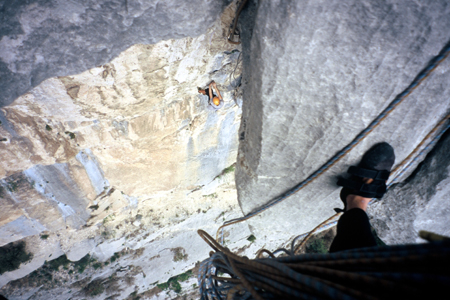 Markus, seen from my hanging belay, 200m up Chrysanthemes wall, Presles > photo Eric Frankenmolen