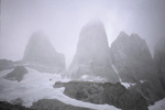 0810, Rognon, Torres del Paine. Day 14, and hopefully our 3rd climbing day. I hand over the binoculars to Ronald, and thwarted by clouds that surround the Central Tower, he tries to get a clue where to go next. We see about four pitches of fixed lines and a haulbag, left by Martin and Gerke after two days of work in the face. We should see some bolted belays above it, but we don't. Scanning the face from left to right, we sometimes discover abandoned fixedlines or a short schling. But no placement seems to make sense. The line Gerke and Martin have climbed so far seems pretty logic, though they never found a single bolt, peg or other kind of fixed gear. So?