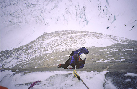 1010, halfway the fixed lines, Torres del Paine. I lost counting. Which belay did I just pass? 5? 6? What on earths sake is going on? Is the ice on the fixed lines giving me a hard time? Is it the pack on my back with a 100 metre rope that is pulling me backwards? I have got no idea. I just do my work and suffer, and hope I´ll be arriving at the top of the fixed lines soon.